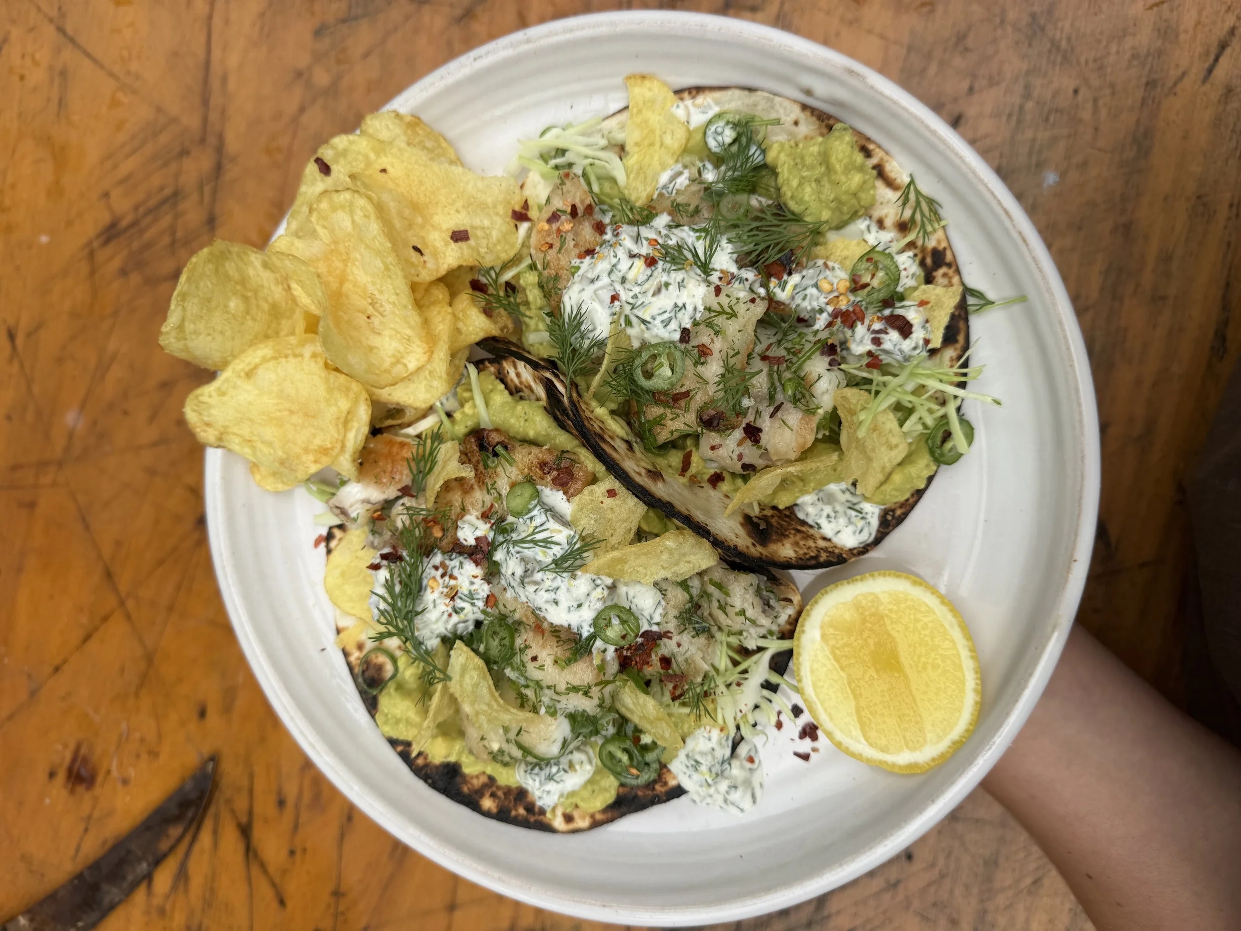 Fill each tortilla with smashed avocado, shaved cabbage, fried snapper, crushed kettle chips, and jalapeño tartare
